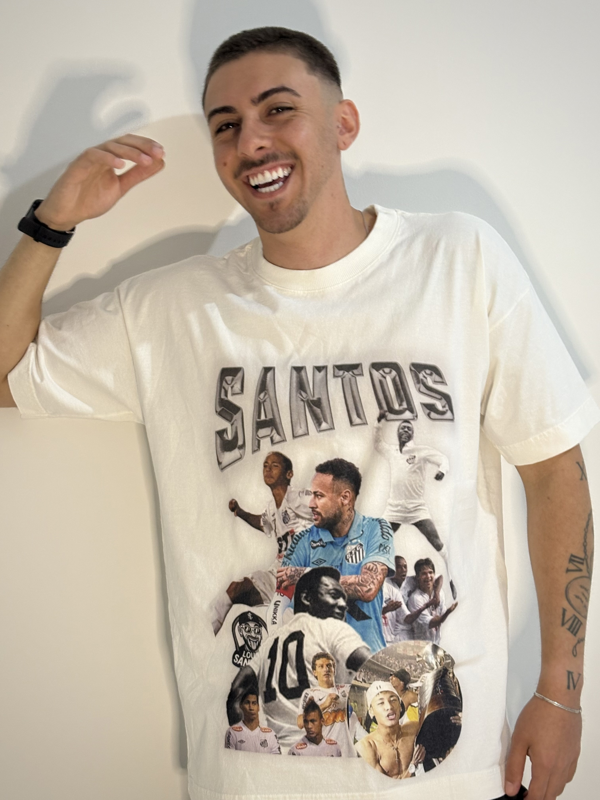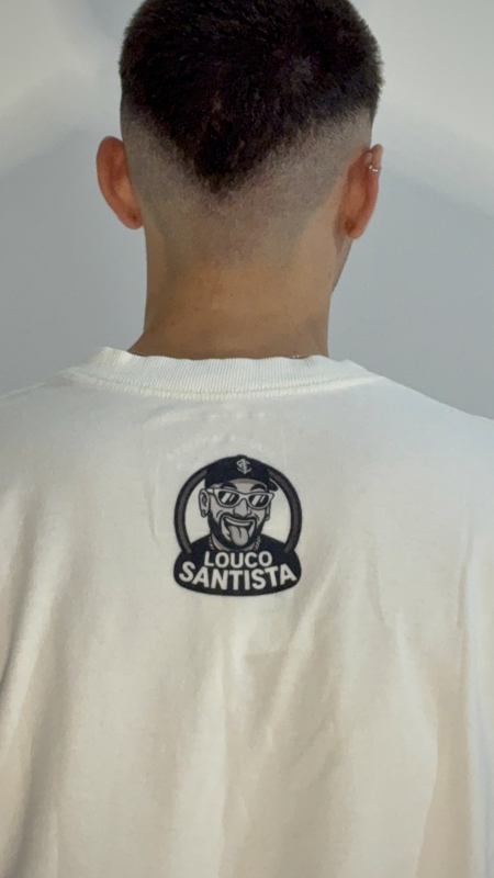 Modelagem e Tecido A modelagem é quadrada e ampla, no estilo oversized, proporcionando uma silhueta moderna e despojada. O tecido é uma malha grossa e robusta, que transmite qualidade logo ao toque. A peça passa por um processo de amaciamento, lavagem comfort e estonagem, resultando em uma camiseta extremamente macia, suave na pele e com um aroma agradável e marcante. A gola é do tipo 2×1, firme e estruturada, valorizando ainda mais o caimento. Na parte da frente, a estampa exibe a palavra “SANTOS” em letras grandes e metálicas, acompanhada de uma colagem com jogadores históricos, momentos de conquistas e taças — todos destacados por um brilho cinza suave. Na parte de trás, próximo à gola, há um detalhe discreto com a logo da Louco Santista em preto. Uma peça que une qualidade premium, estilo streetwear e a paixão pelo Santos — perfeita para carregar com orgulho a história do time.